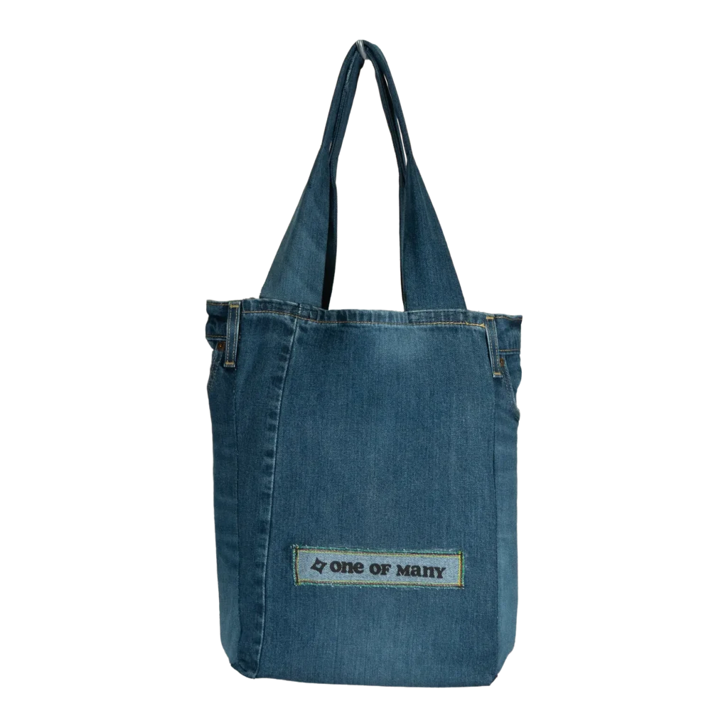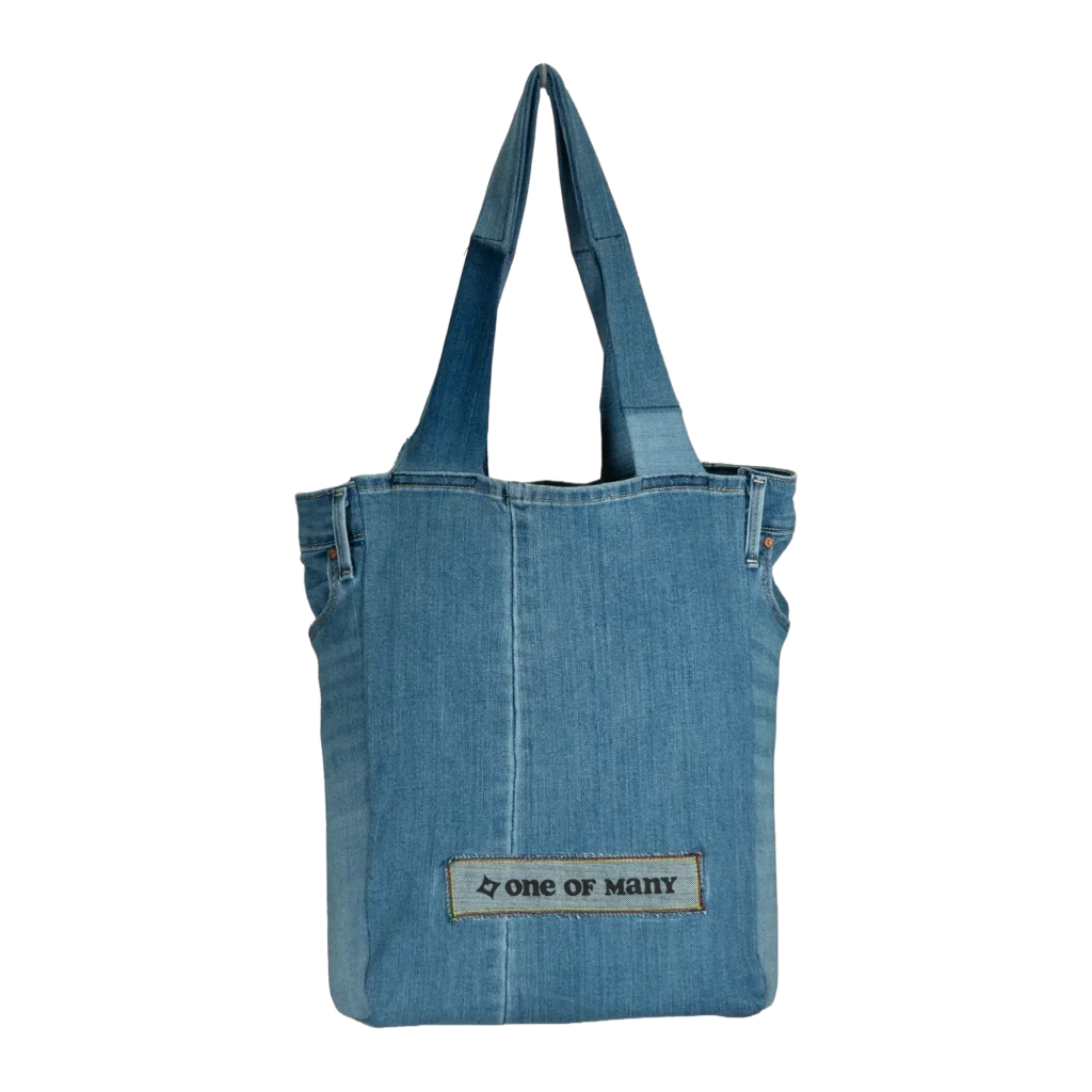 This bag is a jean tote we call the Jote® handmade from upcycling a jean (in this case a light blue jean) and using recycled materials.